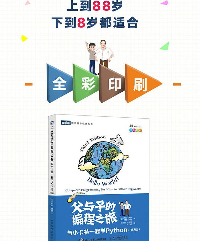 新版《艾伯特父与子的编程之旅:与小卡特一起学python》被誉为Python编程启蒙书,全彩印刷,被众多老师、家长推荐。 《艾伯特父与子的编程之旅:与小卡特一起学python》这本书适合青少年和其他所有Python初学者,尤其适合用作亲子学习材料,全书寓教于乐,趣味游戏与编程知识无缝衔接。问答式讲解,从孩子的视角展现逻辑思维过程。家长、老师、编程小白对这本书赞不绝口,有简入难,锻炼了孩子们的思维能力和创造能力。